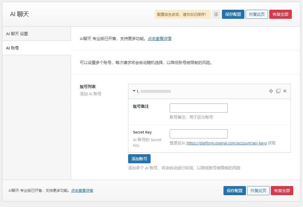 WordPress主题AI人工智能聊天ChatGpt-WP插件1.2.0是一款基于OpenAI GPT模型的智能聊天插件, 可以为您的网站提供智能对话功能。但是在使用该插件时,需要将其账号和接口修改为自己的才能生效, 否则将无法正常使用。此外,由于每个OpenAI账号都有请求限制,建议您设置多个账号, 并将其分别输入到插件中,每次请求将会自动随机选择一个账号,这样可以降低账号被限制的风险