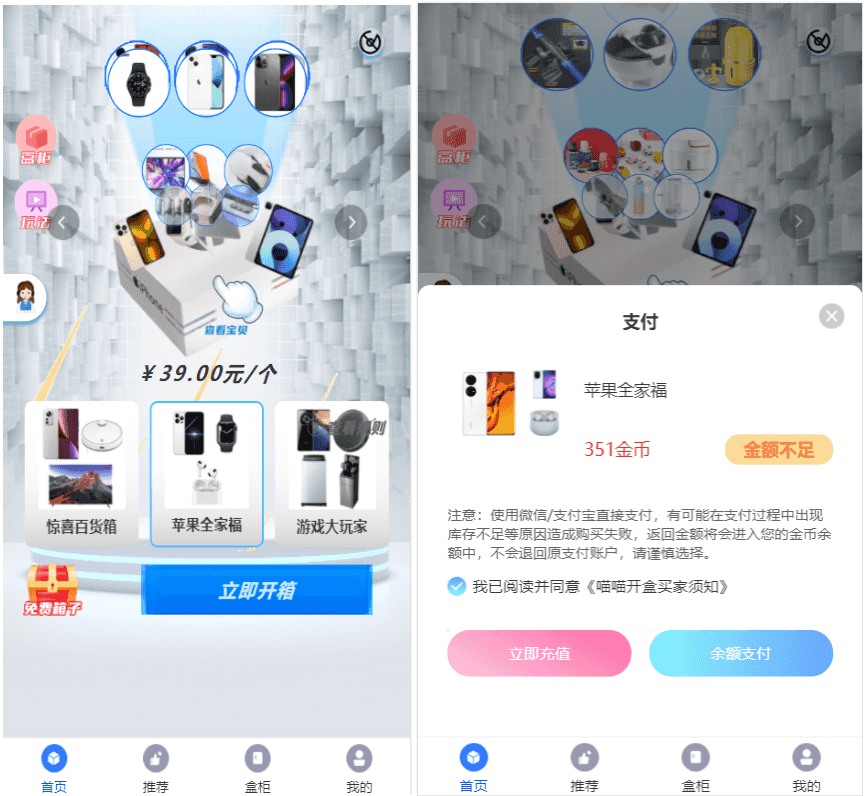 vue+tp5框架编写,H5网页,前后端分离,开源无加密无授权,可以二开使用。 含充值3级分销,盲盒回收成余/额功能/晒图/盲盒转增功能。 带微信无限回调登录、易支付码支付通用聚合接口、短信宝短信、阿里云oss