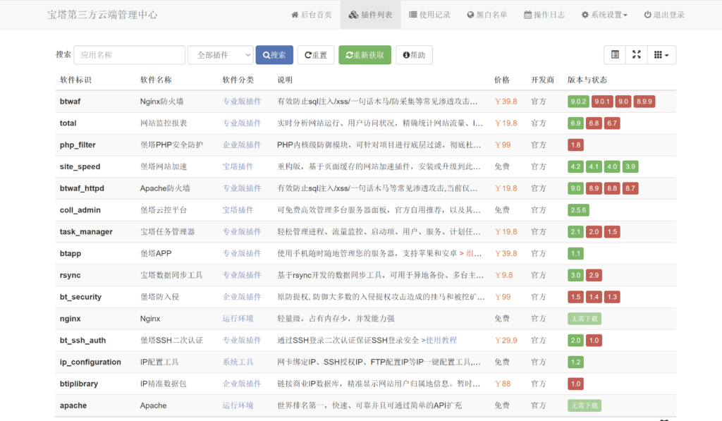 一个用php开发的宝塔面板第三方云端站点程序。 你可以使用此程序搭建属于自己的宝塔面板第三方云端,实现最新版宝塔面板私有化部署, 不与宝塔官方接口通信,满足隐私安全合规需求。同时还可以去除面板强制绑定账号,DIY面板功能等。 网站后台管理可一键同步宝塔官方的插件列表与增量更新插件包,还有云端使用记录、IP黑白名单、操作日志、定时任务等功能。 本项目自带的宝塔安装包和更新包是7.9.2最新版,已修改适配此第三方云端,并且全开源,无so等加密文件。