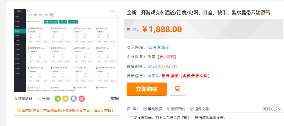 源码修复可用。价格修复,更新2022.03.21.更新日志,YY业务都可用 腾讯暂时不可用 拍前必看:本店所售程序只供测试研究,不得使用于非法用途,不得违反国家法律,不得用于进行违法行为, 否则后果自负!购买以后用作他用附带的一切法律责任后果都由购买者承担于本店无任何关系!请先联系客服看好演示后, 确认无吴后在拍,免责声明:本店所有源码仅供学习参考,请勿用于商业用途! 此类系统是因为安卓系统和苹果系统每个游戏充值比列不一样,有此类系统可以优惠的方式进行充值,减少游戏消耗, 请勿非法运营,非法使用此类系统!如果强行非法运营,后果自负 此程序仅用于学习研究使用,如用于商业用途请持有相关资质 通道更新日志 2021-12-29优化抖音通道更新剑网三金山版通道 2021-12-27新增LOL手游(微信H5)新增来疯星币(双端H5)修复YY紫宝石通道修复YY金钻通道 2021-12-25更新联通话费通道新增花椒双端H5通道更新虎牙通道更新腾讯系列通道 2021-12-12更新YY金钻通道新增YY紫宝石通道(双端H5) 2021-12-06更新腾讯系列通道(金额问题)更新抖音新CK通道更新抖音新免CK通道 2021-12-01新增新版联通话费CK通道(双端H5)更新腾讯系列通道更新腾讯算法更新B站金瓜子(电池) 通道更新抖音CK通道更新抖音免CK通道更新火山版抖音免CK通道 2021-11-23新增QQ天堂PC通道(微信H5)更新联通话费通道 2021-11-16新增快手免CK通道修复快手H5和扫码通道修复YY紫水晶免CK通道(双端)更新YY币微信H5通道更新联通话费通道 2021-11-12更新YY紫水晶免CK通道(双端)修复YY币支付宝回调问题增加电费IOS微信端 2021-11-9新增安卓王者荣耀通道(微信H5)优化QB通道出码速度(微信H5)系统代码进行小小的优化 2021-11-2更新抖音免CK移动端通道(微信H5)更新抖音CK移动端通道(微信H5)更新QB通道(微信H5) 2021-11-1临时更新一下抖音免CK通道(目前是公众号接口)更新国家电网唤起方式(苹果唤起问题解决) 2021-10-19更新联通话费出码逻辑修复设置金额范围无法获取账号问题 2021-10-18新增国网电费通道(支付宝H5)新增MUA语音通道(双端H5) 2021-10-07新增YY紫水晶通道(双端H5)修复系统提权漏洞 2021-09-30新增联通网厅双端H5通道修复Dou+通道恢复抖音H5双端通道更新抖音免CK通道 2021-09-29更新抖音免CK支付H5双通道(新通道出码更快,防封效果极好)更新抖音火山版免CK支付H5双通道 (新通道出码更快,防封效果极好)删除抖音CK通道(直接使用免CK通道就行)修复添加账号的漏洞 2021-09-26增加Dou+通道修复抖音使用代理IP条件的判断条件 2021-09-19新增抖音火山版免CK双端H5通道优化支付出码,减少系统访问次数。 2021-09-16更新抖音免CK通道更新抖音H5通道 2021-09-11为了满足一个没素质的用户的一个需求,新增了一个世纪天成的通道 2021-09-08新增对接方式:兼容易支付对接 2021-09-07新增YY金钻双端通道更新抖音通道新增B站B币通道新增比心通道新增六间房通道新增完美点券通道 2021-08-14更新快手免CK通道 双端H5 2021-08-12更新B站金瓜子(电池)双端H5 2021-08-11优化YY币H5通道增加代理模式增加上号模式增加YY通道 2021-08-05增加虎牙金币通道增加虎牙币通道增加抖音通道增加YY通道增加YY红钻通道更新CK软件增加安全验证 (防止旁人恶意删除账号)增加手动添加商户功能 平台会员用户投稿程序,此程序严禁用于非法用途,仅供研究学习使用。