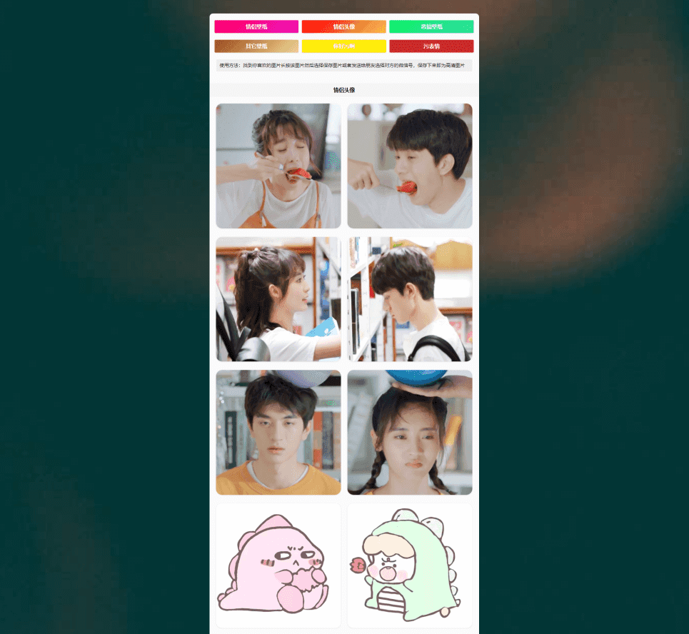 该主题是本人的一个头像壁纸站点的主题,这个站最初是女朋友要让和她用情侣头像和壁纸, 跑到网上转了一圈都没找到一个专门的情侣头像壁纸站,只在知乎某个答案下找到一些情侣头像, 而情侣壁纸就更难找了,找一对的找了很久没找着,奈何没办法只有自己做一个小站,收集了几千张头像和壁纸给自己用。 这个主题没有啥特色就是一个简单的图片展示站,不需要插件配合。 这个不主题不具有通用性,只适合做壁纸和头像网站!