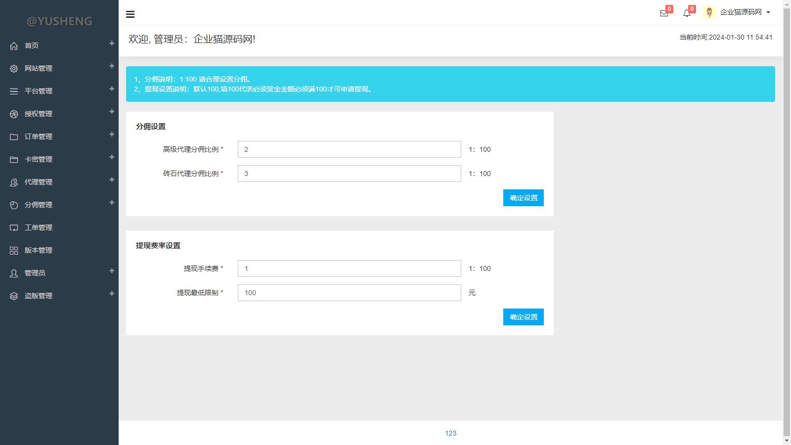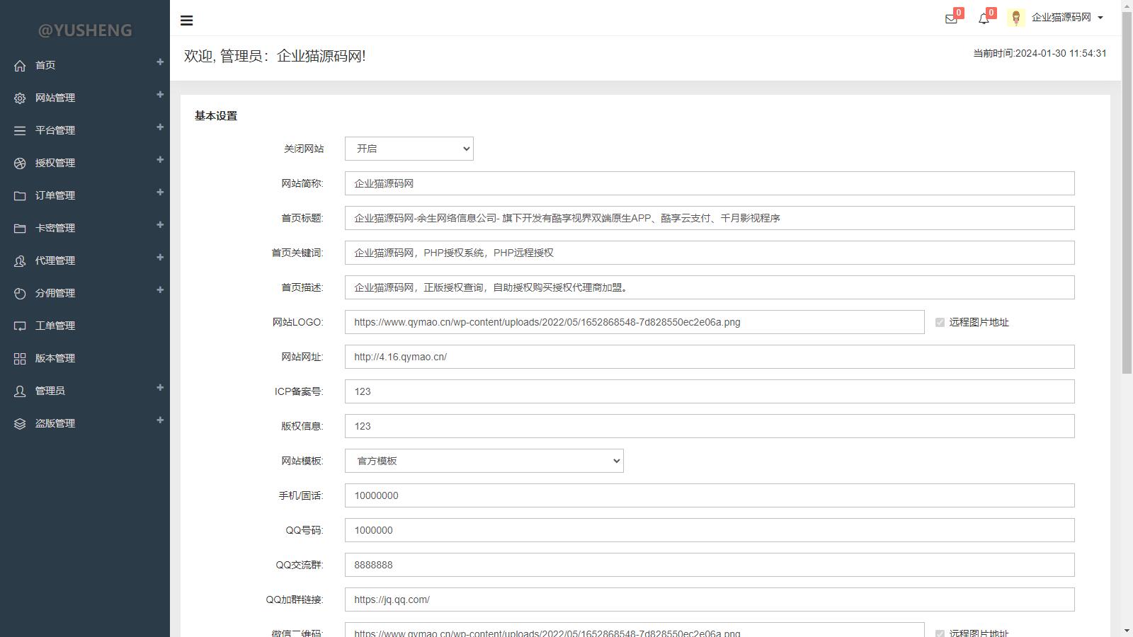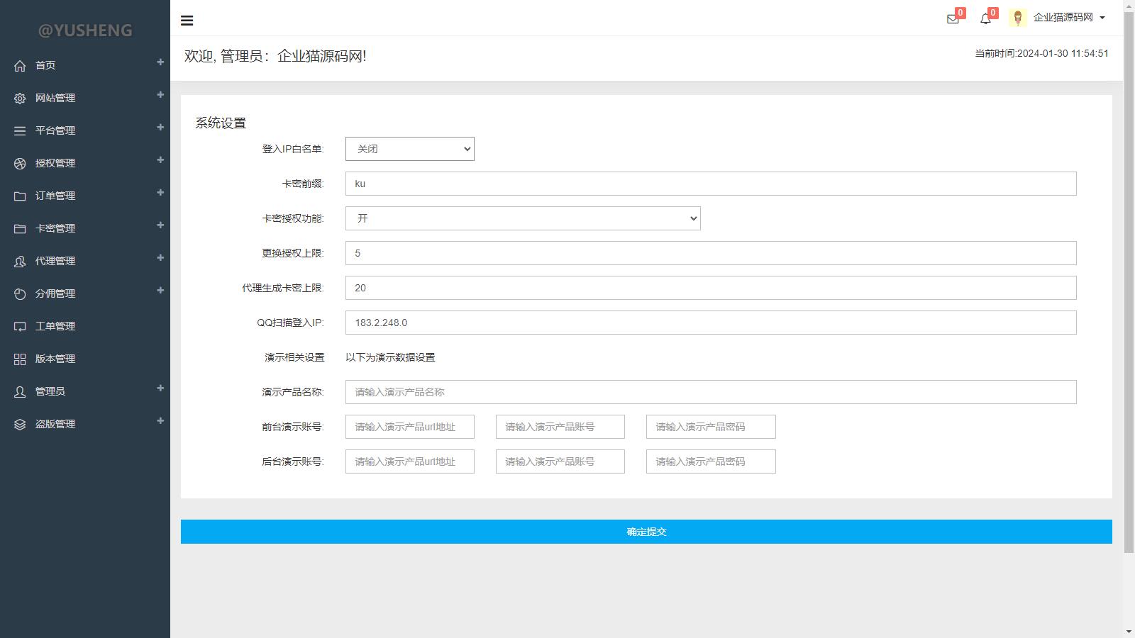 一、企业授权系统功能介绍: 1、网站基本管理、系统设置、公告设置、接口设置、价格设置、下载设置。 2、文章管理、广告轮图管理、添加授权、授权列表、授权日志。 3、支付订单、充值订单、消费订单、生成卡密、卡密列表、卡密授权详情、卡密生成日志。 4、添加代理、代理管理、分佣设置、分佣明细、提现列表、工单管理、版本管理。 5、管理员添加、管理员列表、资源部源码、管理员登入日志、盗版管理、盗版列表、获取盗版密码。