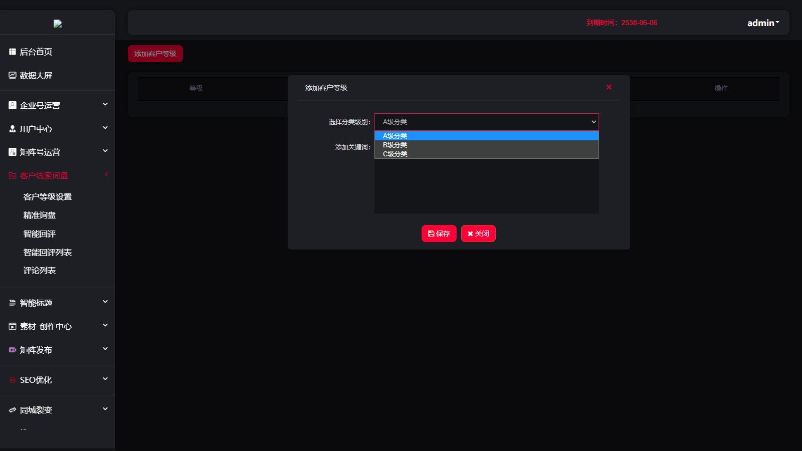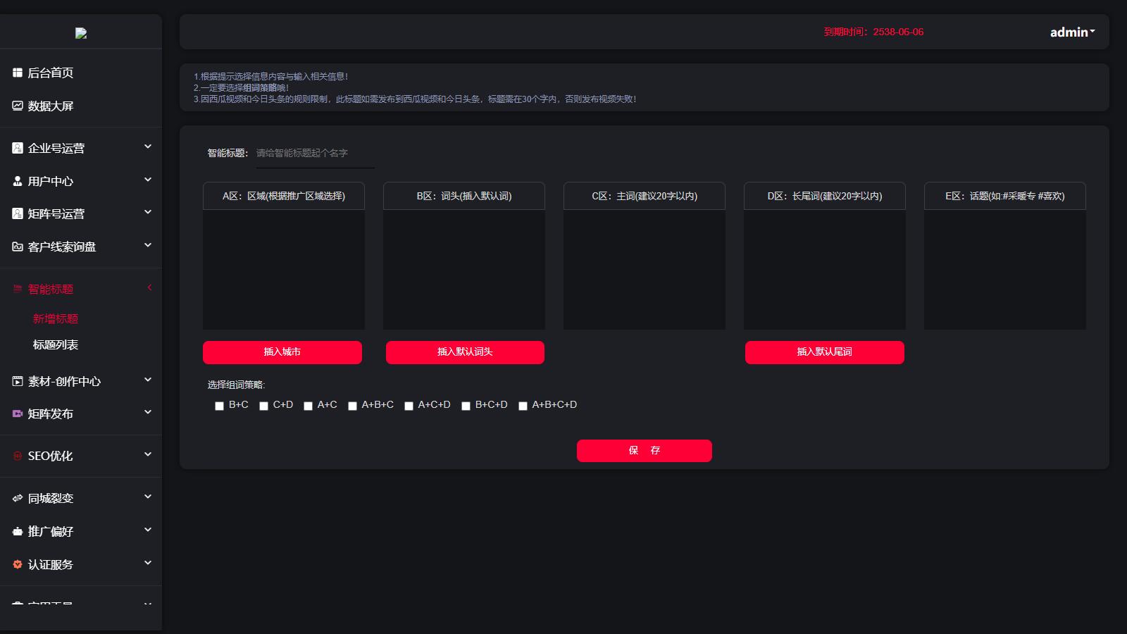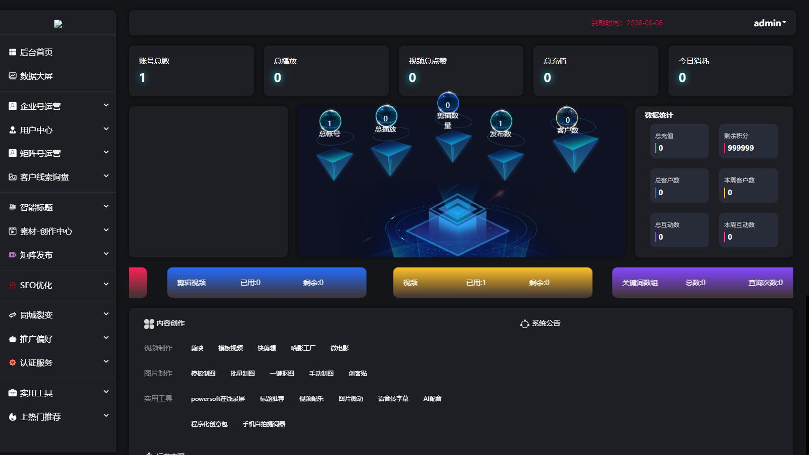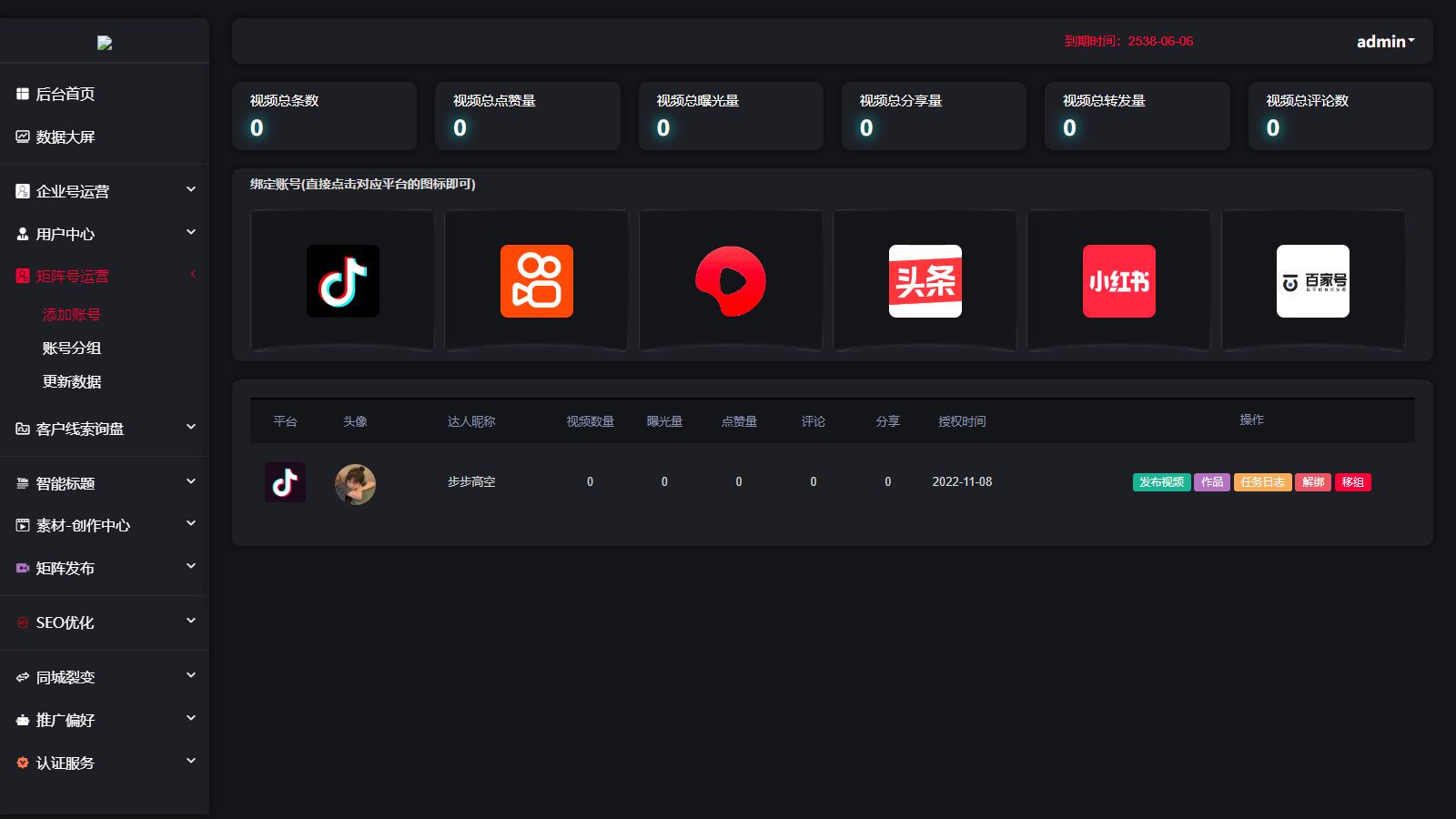 矩阵营销系统多平台多账号一站式管理,一键发布作品。智能标题,关键词优化,排名查询, 混剪生成原创视频,账号分组,意向客户自动采集,智能回复,多账号评论聚合回复, 免切换,免登陆发布….助力您在这个赛道快起步速追赶强获益。 企业猫搭建了下,可以搭建出来,但不知道这玩意咋玩,就没测试后台功能, 仅供学习研究之用,看下功能啥的,商用请支持正版,