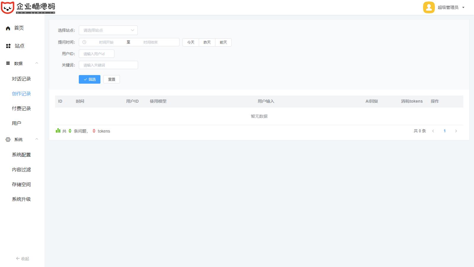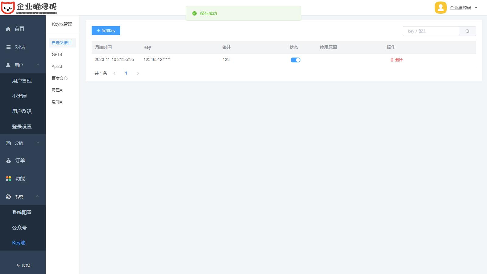 企业猫在11/10搭建了下,可以搭建出来,有两个后台均可修改内容,也未发现弹窗 主要功能: 1、已对接国内百度文心、讯飞星火、Azure GPT、通义千问、腾讯混元、 智普 AI、Claude2 等主流 AI 系统,还可以自建模型对接,目前是功能最全的一款 AI。 2、转发领次数 3、包月套餐 4、关键词过滤功能 5、多开版 6.PC 端绘画