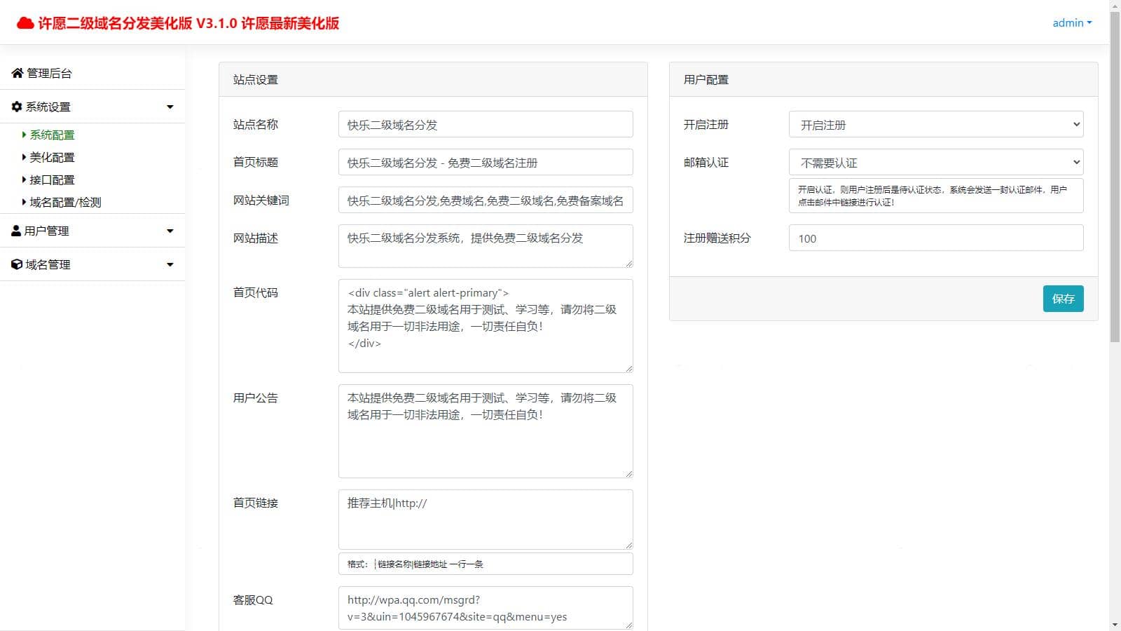 许愿快乐二级域名分发系统v2.0重置版,之前那个源码css失效了, 但是我前几天花了几个小时换了一个源码,把模板放在本地了. 源码下载放在这里了,去除广告。