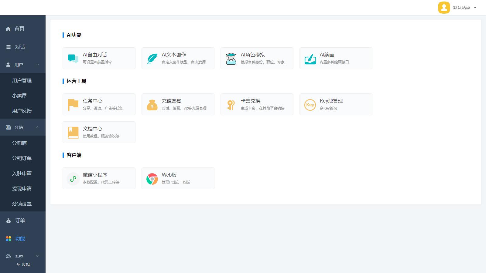 智思AI助手去授权版ChatGPT小程序和H5端源码2.0.3,一个强大的系统, 支持Web、H5和小程序进行数据互通。该源码提供多项功能, 包括后台功能开通、AI自由对话、文本创作、角色模拟、充值套餐和卡密兑换。 企业猫在6/28搭建了下,能搭建出来.小程序没测试。只搭建了下后台 使用D盾检测了下,未发现加密或者危险文件,