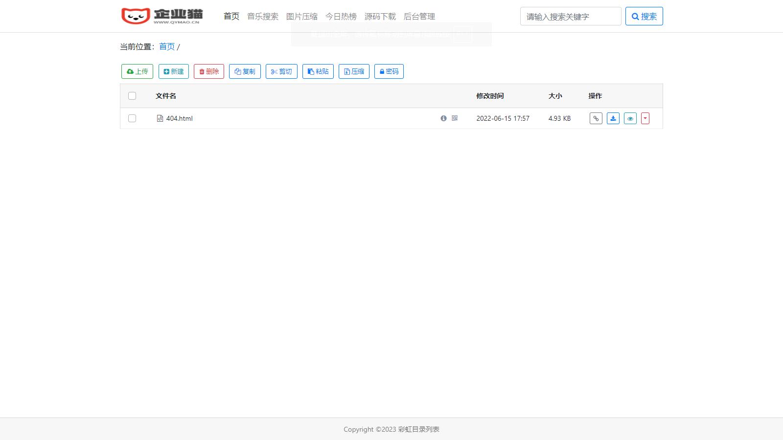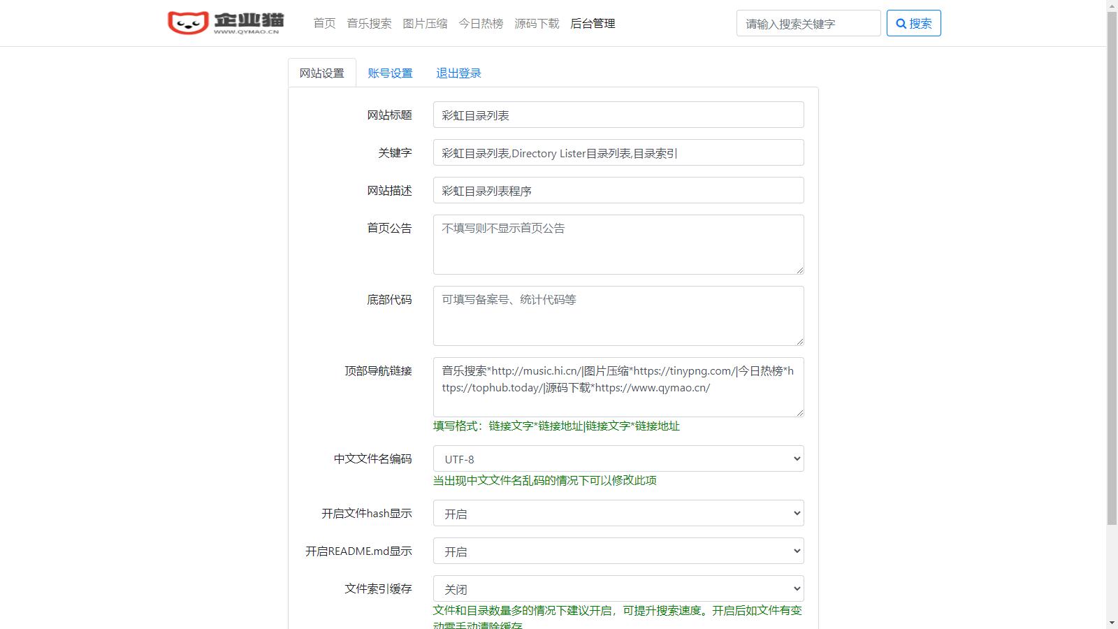在线预览图片、视频、音频、文本文件、Markdown 文件、Office 文档等 自动识别目录下的 README.md 文件并展示(类 GitHub) 后台管理可设置网站标题、公告、底部代码等信息 文件搜索功能,支持缓存文件索引 自带第三方文件管理器 支持中文文件名编码设置,解决乱码问题 支持安装在子目录