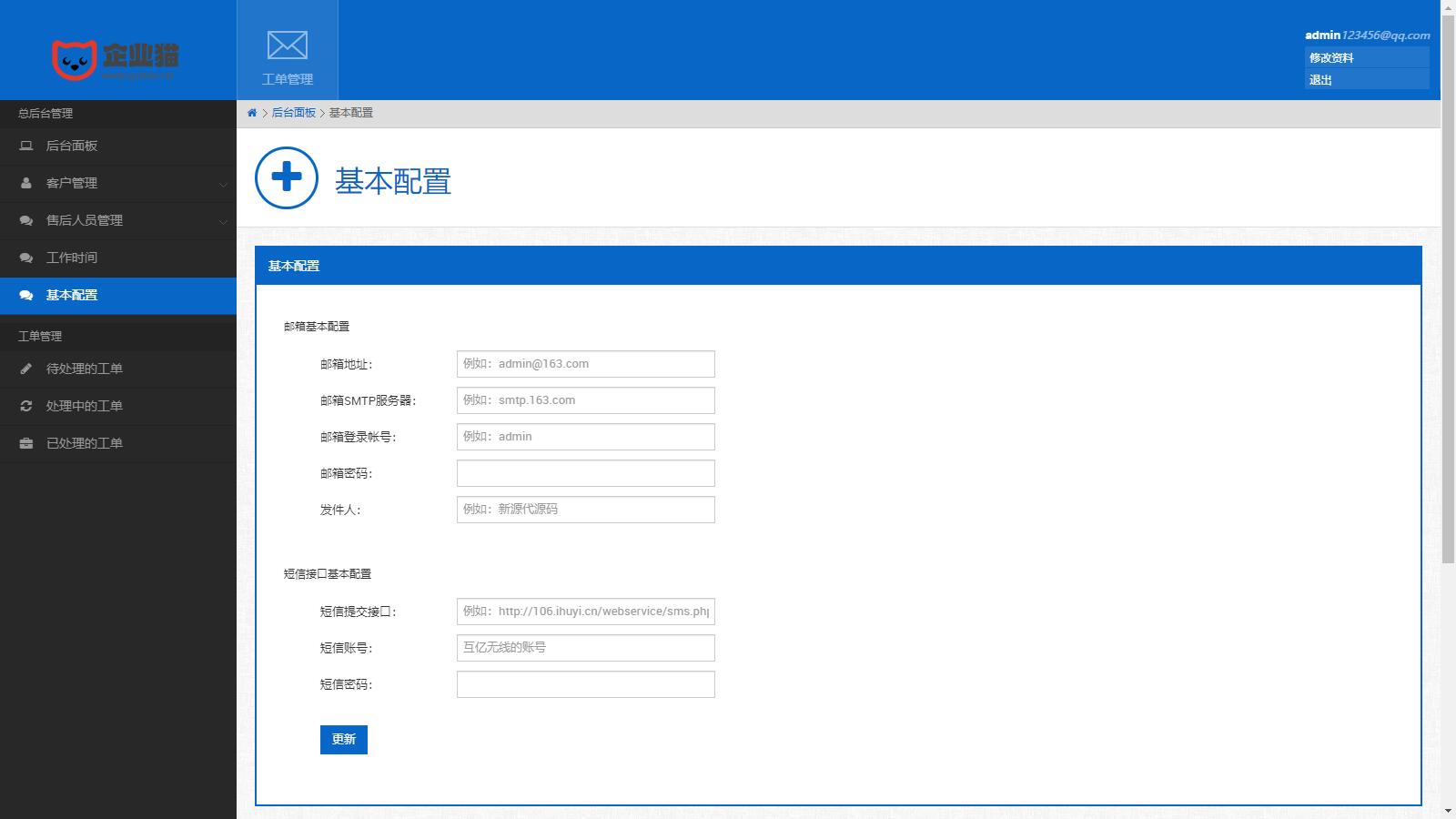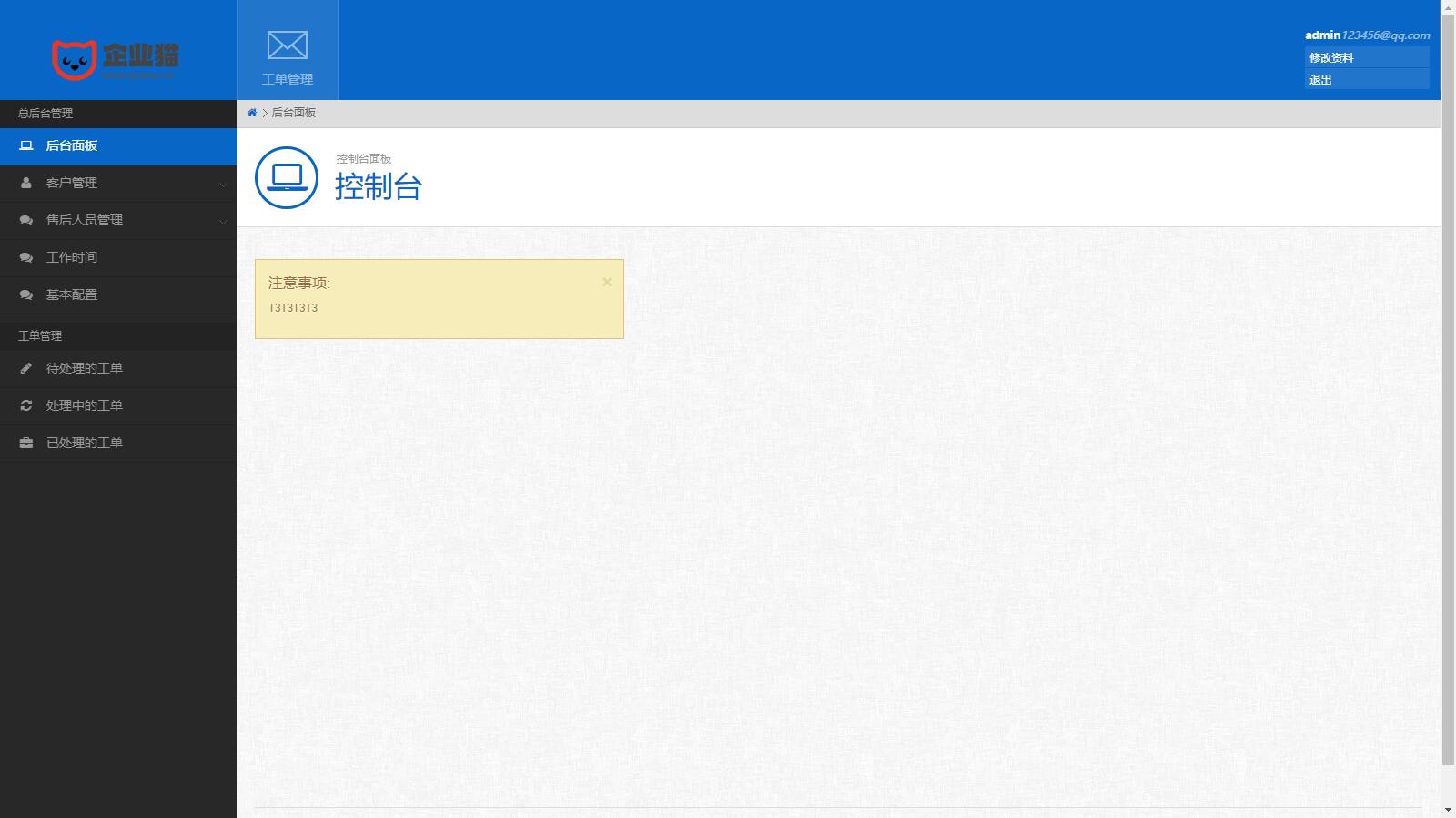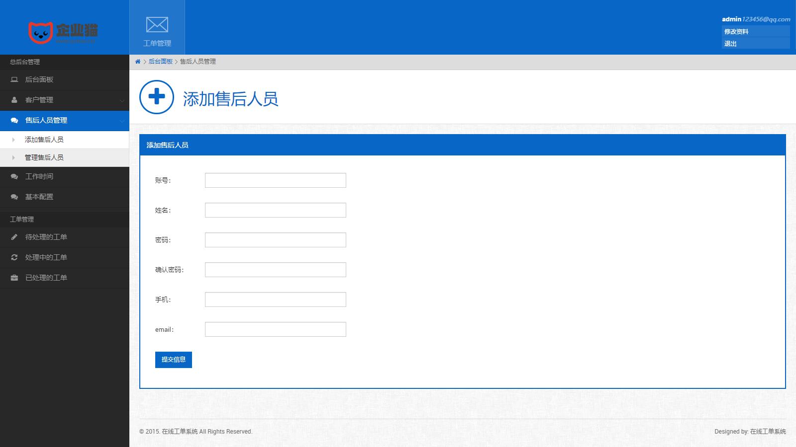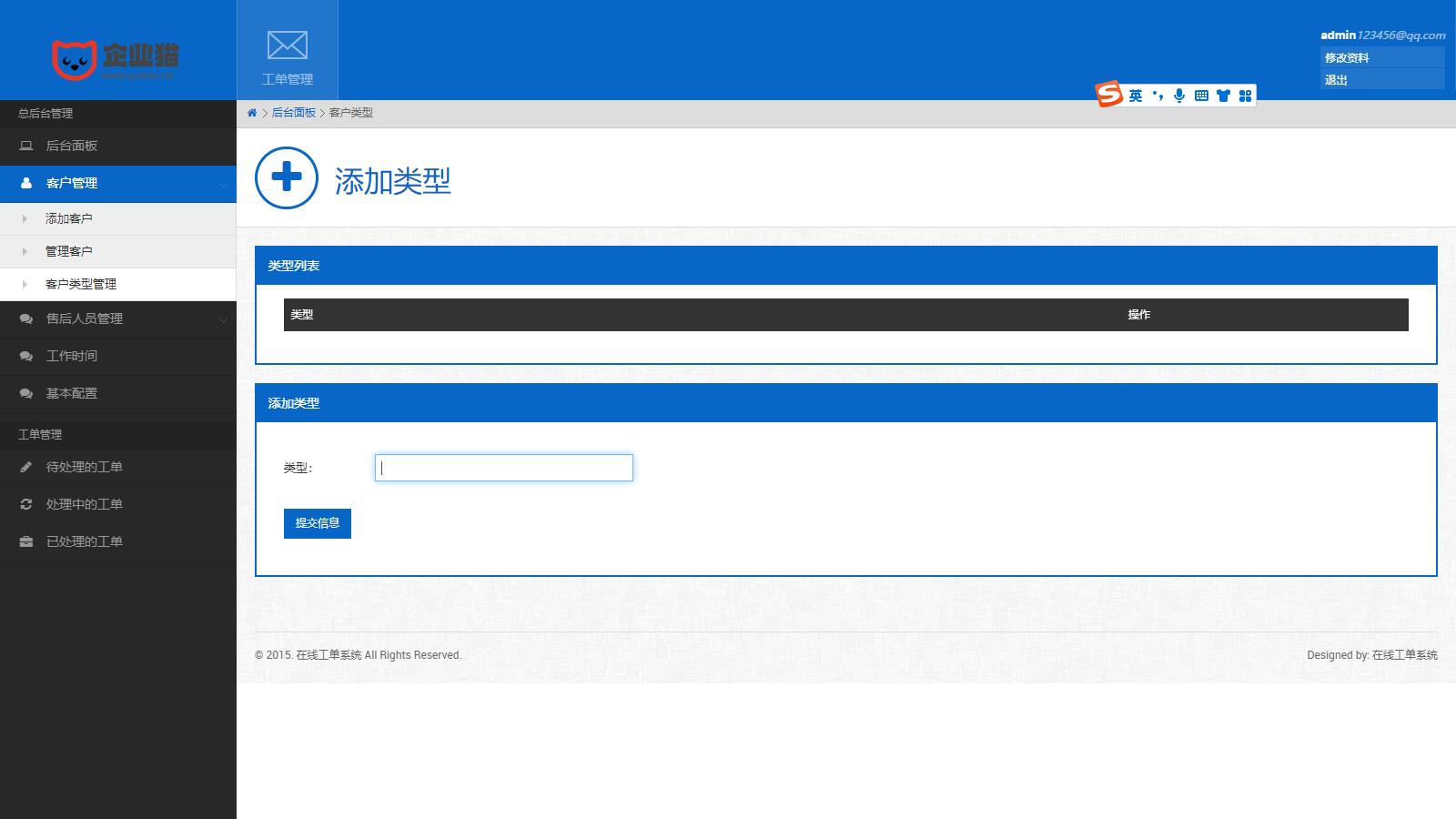 1 :客户管理:可实现对职员的管理,可添加职员,并对不同角色的职员分别进行授权及停用操作。 2 :客服管理:可实现对职员的管理,可添加职员,并对不同角色的职员分别进行授权及停用操作。 3 :问题分类:比如 Java 类型客户, PHP 类型客户, .NET 客户类型等。 4 :邮箱配置:可配置比如 163 邮箱等 5:工单查看 6:待处理的工单 7:已处理的工单