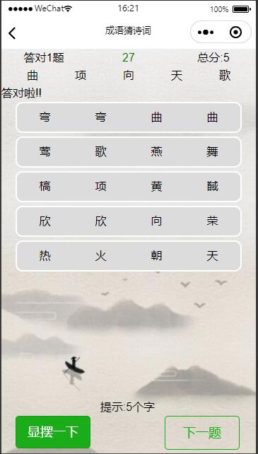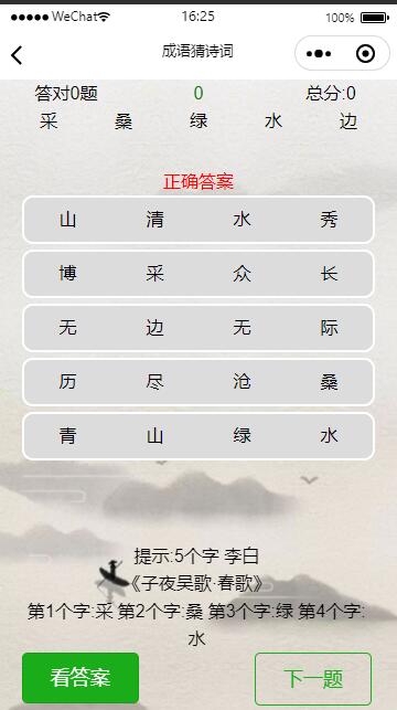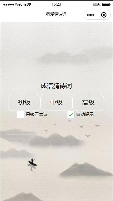 看成语猜古诗句智力考验小程序源码 这是一款猜诗句的一款小程序, 特别考脑力,里面拥有低、中、高三种难度,用户通过猜所提供的成语, 然后猜出是哪句古诗。当然啦下方也是会有小小提示的, 比如古诗作者名字或者古诗的名字或者第一个字是什么等等, 然后用户就通过给出的提示来猜了