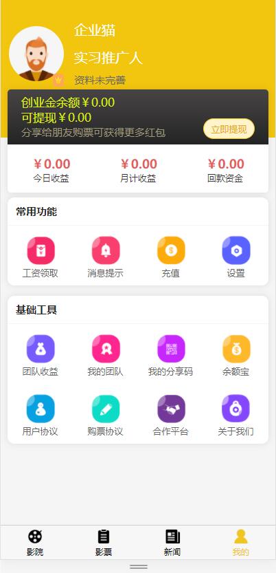 功能: 1、登录注册,充值提现,邀请好友,查看团队以及收益 2、购票,排座,返利 3、新闻资讯 4、余额宝购买返利 开发框架: 前端uni+后端php开发