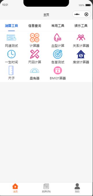 不需要任何服务器和云服务资源,拥有海量工具,功能不断增加,支持流量主 测算工具: 网速测试,计算器,血型计算,关系计算器,一生时间,尺码计算,色盲测试,房贷计算器,尺子 ,量角器,BMI计算器 信息查询: 今天吃什么,粤语翻译,福布斯排行榜,Ip查询,常用号码,国旗头像,每日一图,图片拼接,九宫格切图 常用工具: 节日倒计时,手机清灰,随机数,大转盘,全屏时钟,取色器,文本解密,全屏弹幕,震动,二维码创建,文本加密,倒计时,二维码识别 娱乐工具: 恶搞理发器,插电充钱,数钱,2048小游戏
