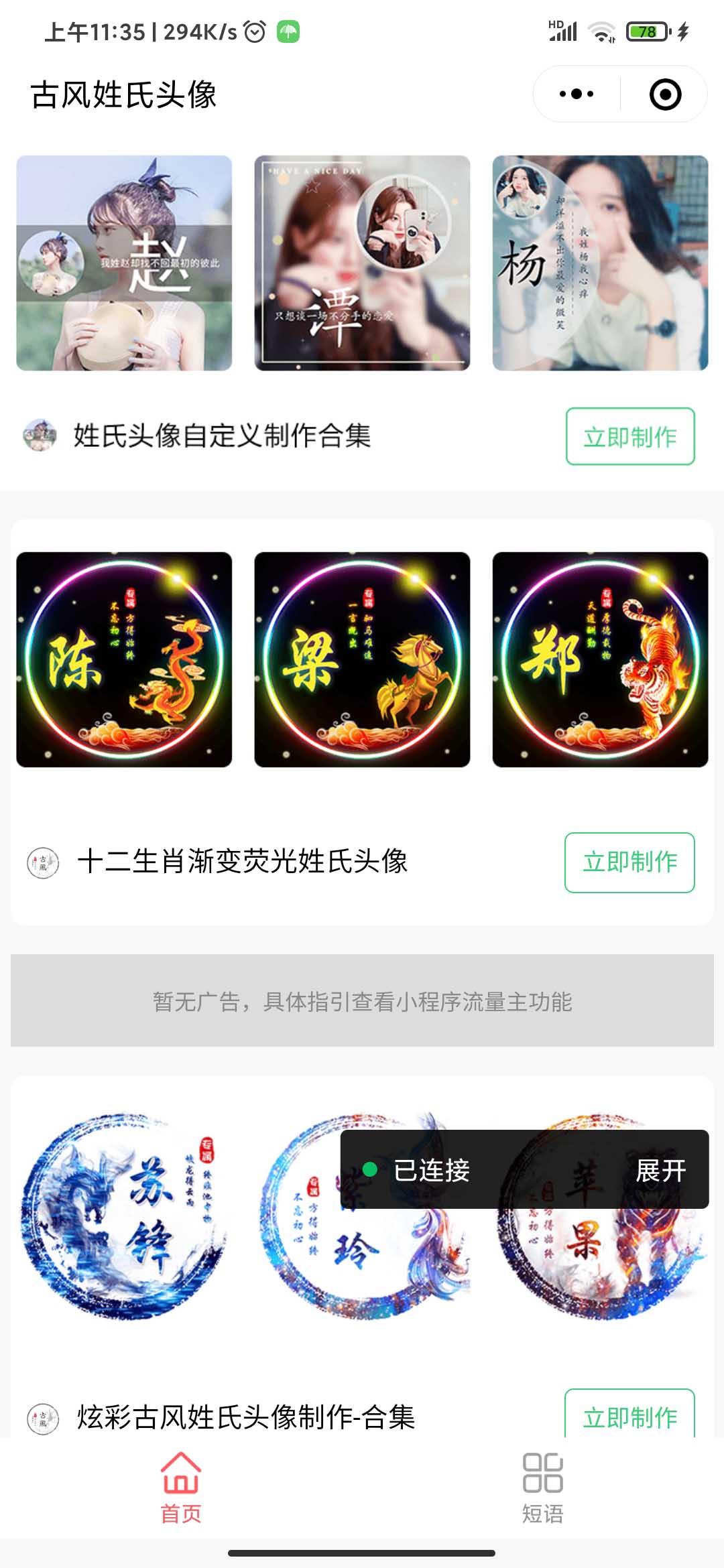 该源码免服务器和域名,操作简单 内包含了多种模板制作,风格多样 比如最近比较热门的姓氏头像,虽然该主题是以姓氏为主 但是姓氏主题也分很多种模板,并以复古,酷炫,清纯等等为模板 另外在制作的时候还支持短语选择哟,离职短语,姓氏短语等等 至于具体的就 不多说了 对了其实该款源码在拿到手的时候是有一点问题的就是最后生成的时候会卡在验证这里 不过后来经过一位热心的网友的修复,目前已经解决该问题了,直接绕过验证生成 安装方法还是老样子,微信开发者工具打开源码然后设置一下合法域名即可上传审核