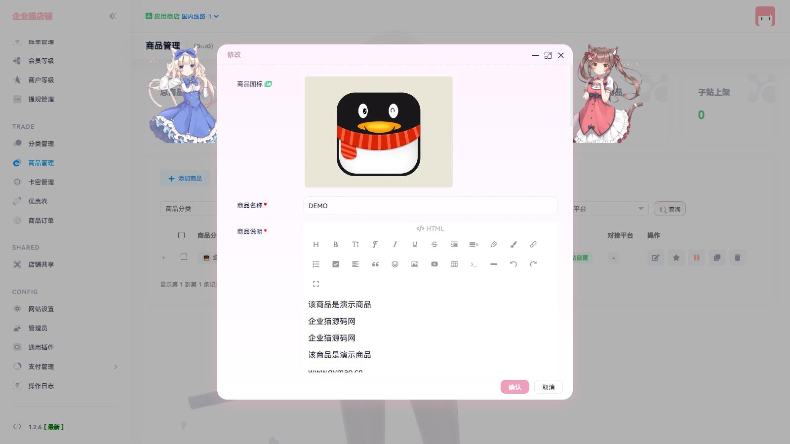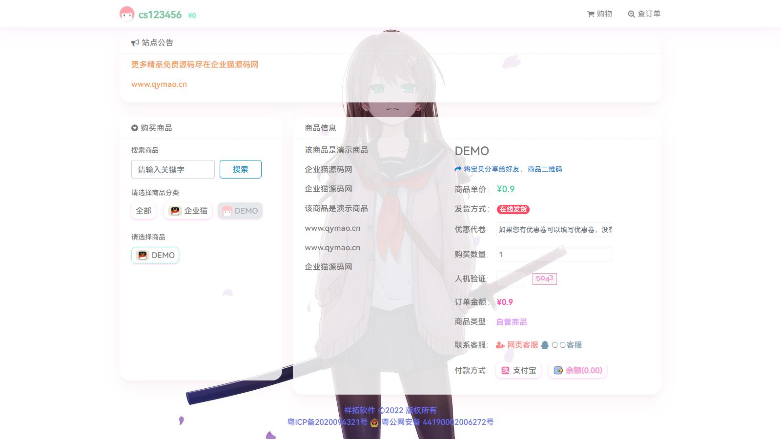 – 支付系统,已经接入易支付及 Z 支付免签接口。 – 云更新,如果系统升级新版本,你无需进行繁琐操作,只需要在你的店铺后台就可以无缝完成升级。 – 商品销售,支持商品配图、会员价、游客价、邮件通知、卡密预选(用户可以预选自己想购买的那个账号或者卡号)、 API 对接、强制登录购买、强悍的自定义控件功能、限时秒杀、批发优惠、优惠卷、等众多功能。 – 分站系统,前台用户可以开通分站,分站可以独立运行,也可以卖主站商品,有点类似商业发卡了。 – 推广 / 代理系统,拥有三级分销返佣功能,注册账号即实现自动发展下级。 – 共享店铺系统,可以在后台直接对接别人的店铺,通过扣除余额来进行无感知进货。 – 应用商店,拥有众多插件以及模板,让你的店铺变得格外强大。 – 界面美观,完美支持 PC 和手机,真正的内外二次元文化。 – 强悍的扩展能力,你可以通过本程序在几分钟之内快速的实现你任意想实现的在线购物功能,例子如下: – 游戏方面,物品购买即时到玩家背包 – 商业软件余额充值 – 商业软件自动授权 – 论坛 / 社区 VIP 自动开通 – 只要你想得到,没有做不到。 – 还有更多强大的功能,需要安装自己发掘。