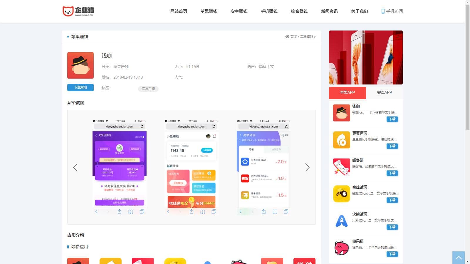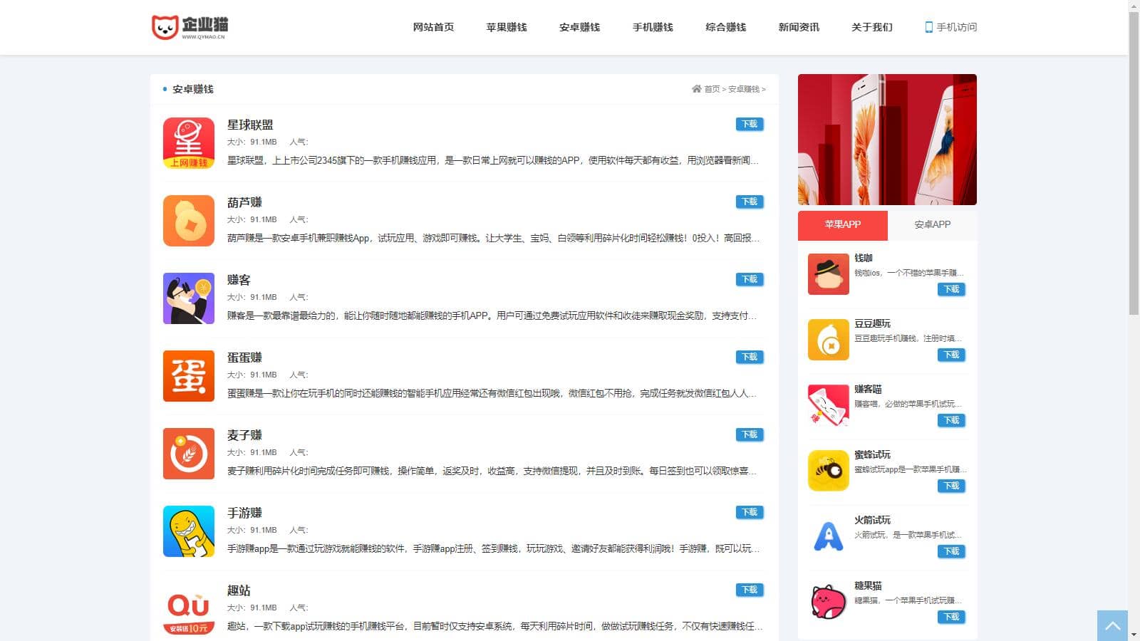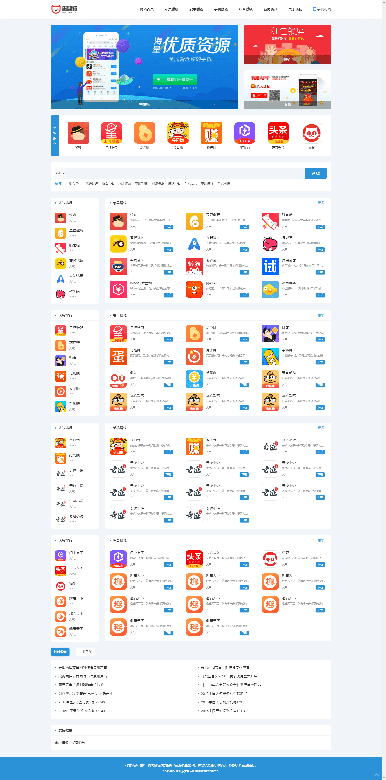 一款简洁蓝色的手机软件应用app下载排行,app下载平台,最新手机app发布网站响应式织梦模板。 主要有:主页、app列表页、app介绍详情页、新闻资讯列表、新闻详情页、关于我们等模块页面。