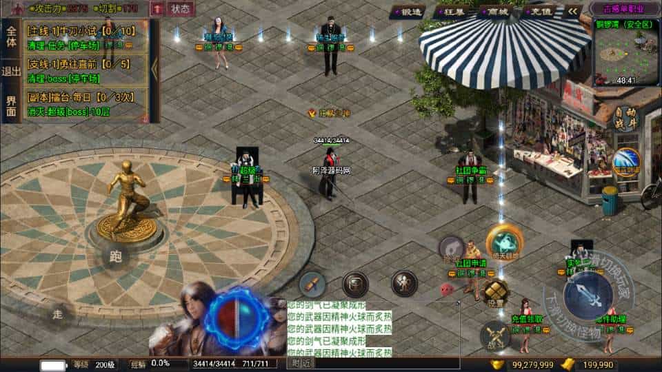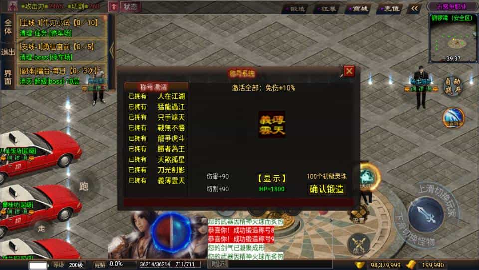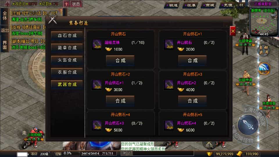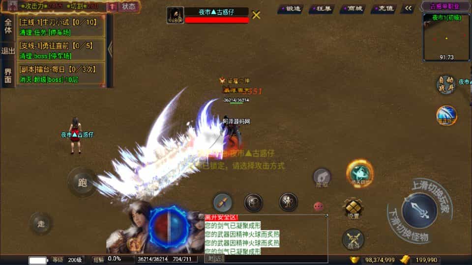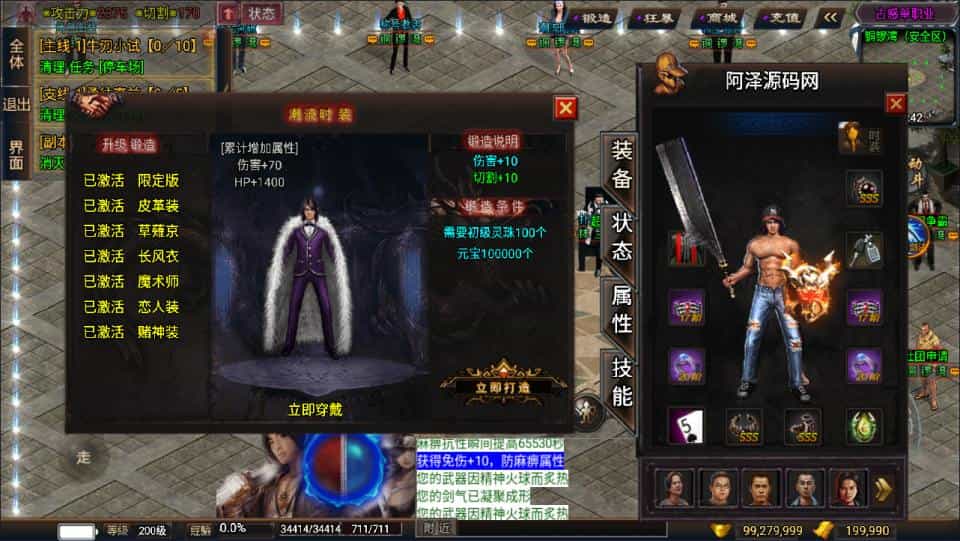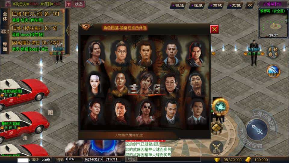 【版本BUG有点多,自行研究修复,介意勿下】 01:单职业群攻超炫技能 02:任务系统:主线任务,支线任务,擂台-副本-每日三次) 03:狂暴系统:狂暴之力,洪荒之力 增加切割伤害 04:转生系统:共9转(晋升需”初级灵珠+元宝”) 05:时装系统:限定版,皮革装,草薙京,长风衣,魔术师,恋人装,赌神装(晋升需”初级灵珠+元宝”) 06:称号系统:人在江湖,猛龍過江,只手遮天,戰無不勝,龍爭虎斗,勝者為王,天煞孤星,刀光劍影,義薄雲天(晋升需”初 级灵珠+元宝”) 07:技能修炼:6个技能可以修炼5重,成功几率30%,可增加切割伤害和技能等级(需”初级灵珠,高级灵珠,超级灵珠+ 元宝”) 08:角色图鉴:共12个古惑仔人物图鉴,可增加切割,攻击,血量,暴击需”初级灵珠,高级灵珠,超级灵珠+元宝”) 09:地图分布:初级地图(停车厂,下水道,屋村,夜市,道场)共5个图 10:地图分布:高级地图(足球场,台球厅,动漫城,麻将馆,百家乐)共5个图 11:地图分布:超级地图(铜锣湾,钵兰街,兰桂坊,八仙饭店)共4个图 12:单体技能:先天剑法,天神剑法,雷霆剑术,天神之怒,一剑开天,倚天辟地 13:群攻技能:旋风剑术,神剑斩,冰封剑阵,剑刃八方,倚天辟地(全屏) 14:控制技能:狂暴充值,擒龙手(定身5秒),十步一杀(定身5秒) 15:装备划分:共20阶装备。 16:合成系统:雨夜屠夫(血石),FM51哈雷(勋章),鸭舌帽(头盔),香奈儿牛仔裤(衣服),开天辟石(武器),(灵珠或元宝合 成) 17:回收系统:15阶装备回收元宝,15阶以上装备回收”初级灵珠,高级灵珠,中级灵珠” 18:商场系统:4货币商场/可以卖经验卷,常用道具物品(根据需要添加) 19:特效说明:切割血飘,野蛮特效,背包比较箭头,自动穿装(戒指手镯除外) 20:技能触发:致命一击,每10次攻击触发一次( 双倍攻击2秒) 21:技能触发:倚天辟地(全屏),每30秒攻击触发一次( 双倍攻击5秒) 22:多功能背包:仓库,摆摊,回收,邮件,动态背包 23:雪飘系统:独立的雪飘,暴击特效,切割雪飘 24:怪物百分比血条,BOSS超大血条 25:添加手动拾取按钮,点击后可以拾取物品 26:增加拾取动态特效,增加多元素血飘 27:优化怪物人物血条显示效果 28:挂机自动释放群攻技能 29:版本升级更新免费、可以选择(单职业)玩法、 30:动态公告:增加动态公告宣传片