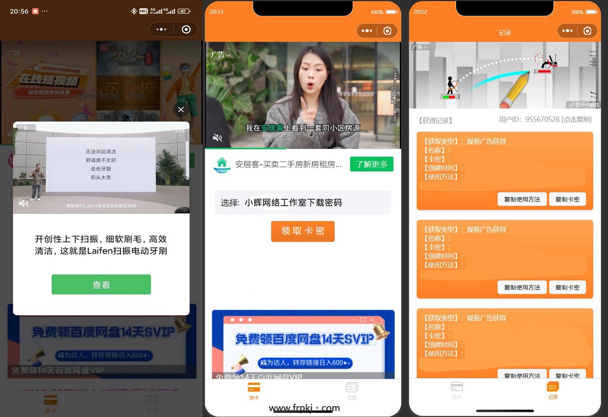 2024新版二开微信发卡小程序源码卡密系统流量主功能裂变扩展多种领取模式二次开发的发卡小程序源码, 其后台采用PHP编写,支持用户通过付费购卡或者观看视频广告领取卡密,该小程序还支持流量主, 因为功能需要,我就进行了二开,这套源码是在原基础上进行了功能优化,而且测试搭建表现良好! 版本介绍: 1.修复分类介绍报错 2.修改前端UI 3.增加插屏弹出广告 4.禁止PC端使用(PC端小程序没有广告) 支持:添加分类丨分类介绍丨导入卡密丨卡密使用说明; 支持:直接领取丨观看广告领取丨广告+分享领取丨购买领取;