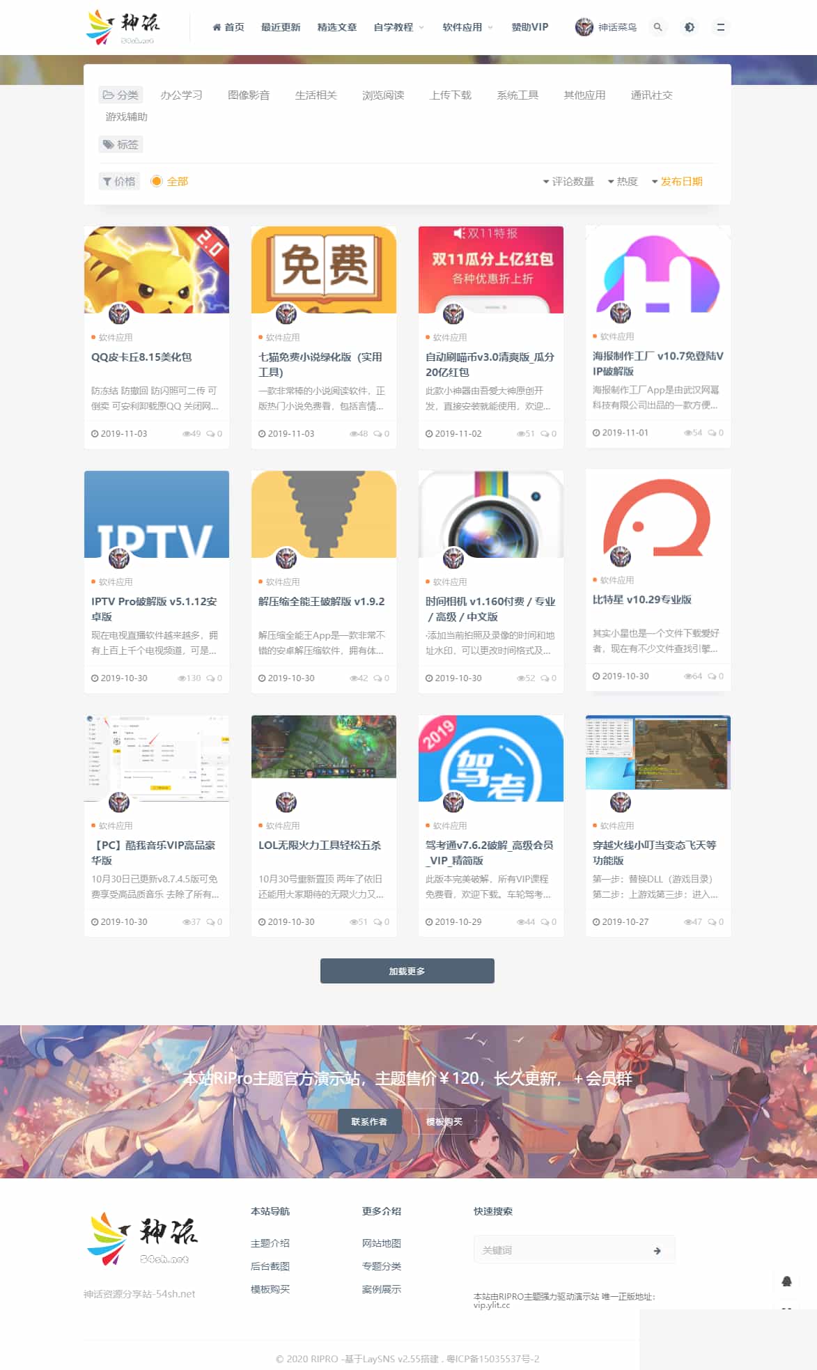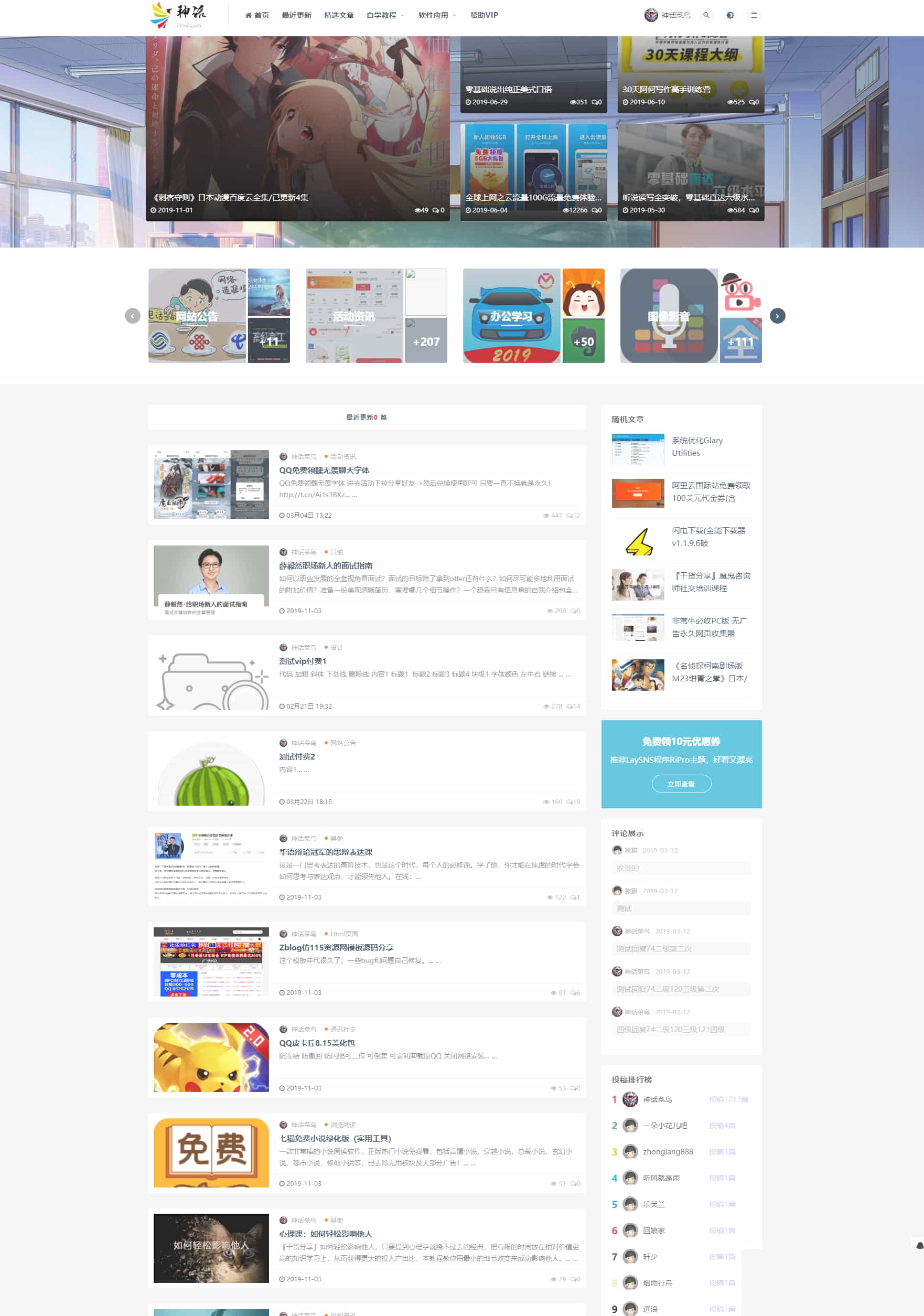该主题是网上泛滥的RiPro主题仿制而成的laysns模板,原主题是很强大的, 全站功能是通过ajax响应实现的,但本人技术有限,只会仿,不会移植,(主要ajax这里不知道怎么弄)。 另外就是网上流传得比较多的是美化版,我仿时不知道, 于是现在弄出来的是官网的那样版本,总之我会在下个版本更新成美化版的。 主要说明:付费/回复下载功能的,需要安装后台附件插件(其他下载类插件别问我,我没用过),否则无法使用。 更新如下: 1、修复下载弹窗获取链接功能,统计下载数量; 2、增加文章限制内容,下载附件支持添加演示链接; 3、优化并添加美化版下载页面模块; 4、增加全站统计功能; 5、重新优化修复文章/下载列表付费/免费/评论/热度排序功能; 6、增加首页顶部大图轮播功能; 7、首页更新列表支持博客模式切换; 8、重新优化夜间模式功能; 9、增加首页、列表页文章一键收藏功能。 10、优化文章发布页描述词自定义功能; 默认免费下载需要登录。网站AJAX响应式跳转,网站图片懒加载, 文章图片自动添加alt ,日夜模式切换,多种排序列表,无刷新加载下一页。 公告功能的修改的话,后期再出插件控制。 广告位置你自己找位置放,我不会因为你一两个广告位置,而改得乱七八糟的,模板本身就有广告,自己看着改,