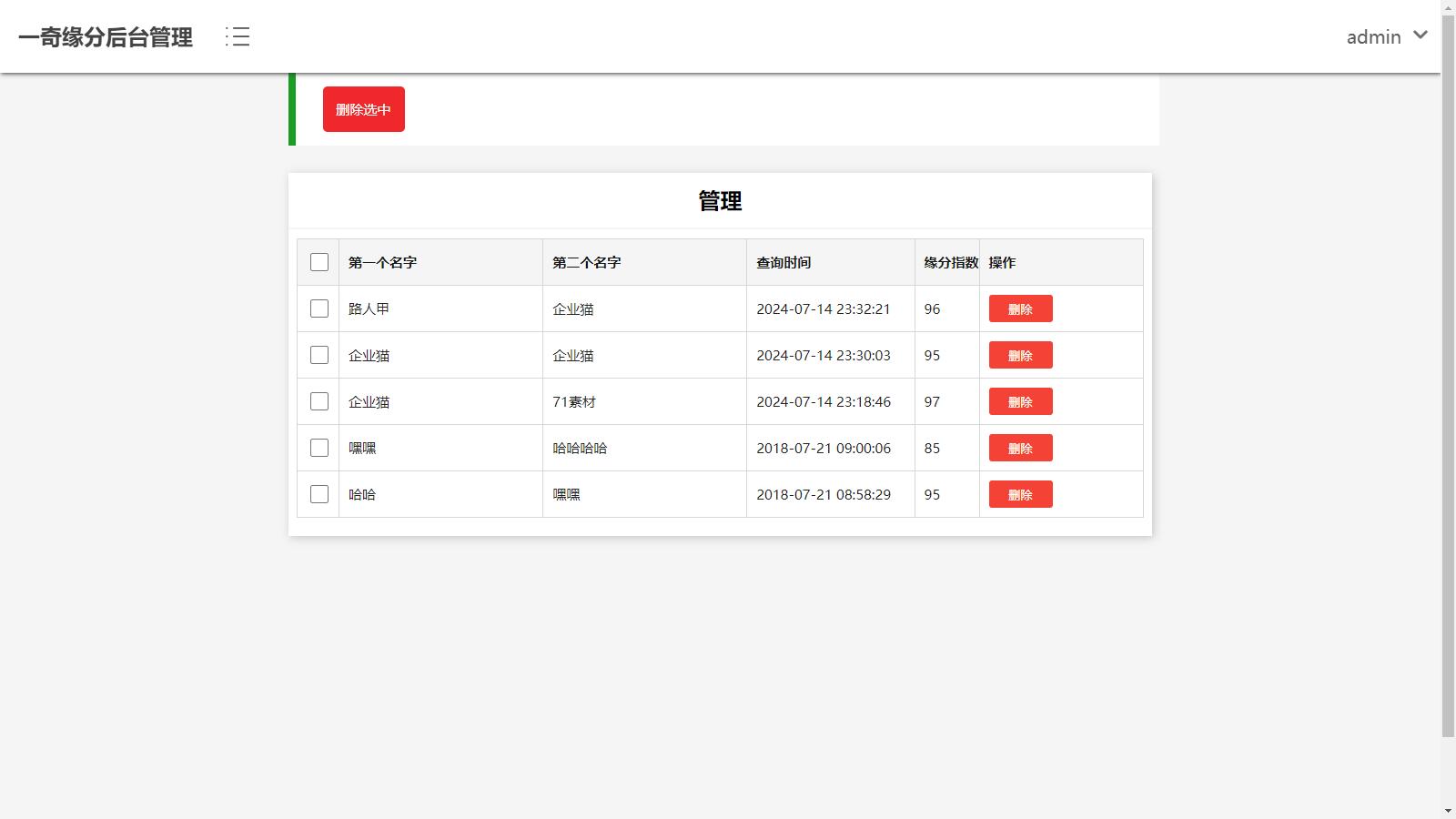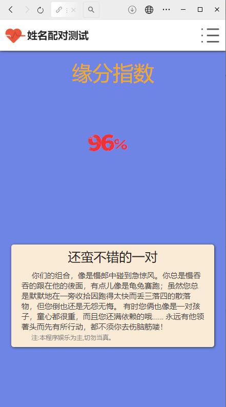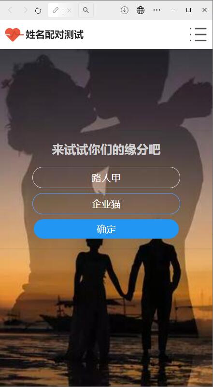 基于PHP+MYSQL开发制作的趣味测试网站源码。可在后台提前设置好缘分, 自己手动在数据库里修改数据,数据库里有就会优先查询数据库的信息, 没设置的话第一次查询缘分都是非常好的 95-99,第二次查就比较差 , 所以如果要你女朋友查询你的名字觉得很好 那就得是她第一反应是查和你的缘分, 如果查的是别人,那不好意思,第二个可能是你。