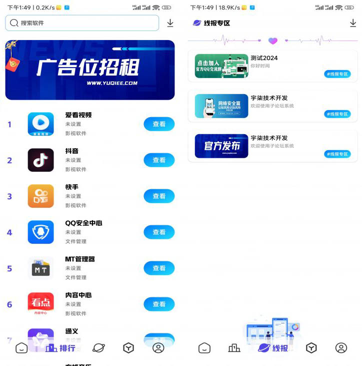全新版本应用商城是一款由软件库、线报分享、程序工具箱三合一聚合程序源码。 软件(文章)支持免费、密码、会员、付费、卡密、广告多种限制类型, 不仅适合引流还适合进行流量变现,给每日收入带来一笔新增长! 更值得注意的是软件(文章)发布对接了蓝奏云,并支持一键部署上传 (一键部署只需选择软件安装包即可同时设置完成:软件图标、软件名称、 以及下载链接。),大大提高软件(文章)发布效率(速度)! 另外本程序源码的数据传输采用了RC4密钥加密,配合程序自带防抓包功能则可以有效的防止数据泄露的风险! 本款源码经过多次优化,现在部署起来将更加简约快捷,只需复制粘贴密钥即可部署完成, 适合任意人群,纯粹的无脑操作即可!现在的你还在等什么?不管是想拥有自己的一款APP, 还是想自己在网上赚钱,本程序源码都是一个不二之选!视频教程已为你准备好,快下载部署吧!