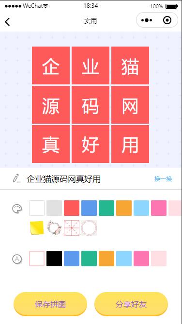 主要功能有文字九格、头像挂件生成、爆趣九宫格、形状九宫格、创意长图、情侣头像、猫狗交流器。 这个QQ微信小程序源码是纯前端的,基本上拿去就可以用,不过好像调用了很多API,