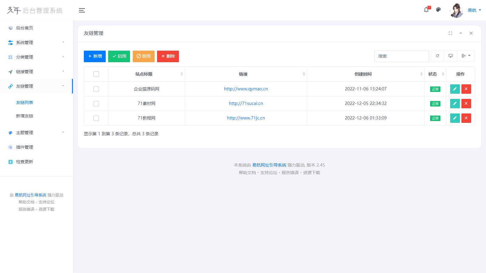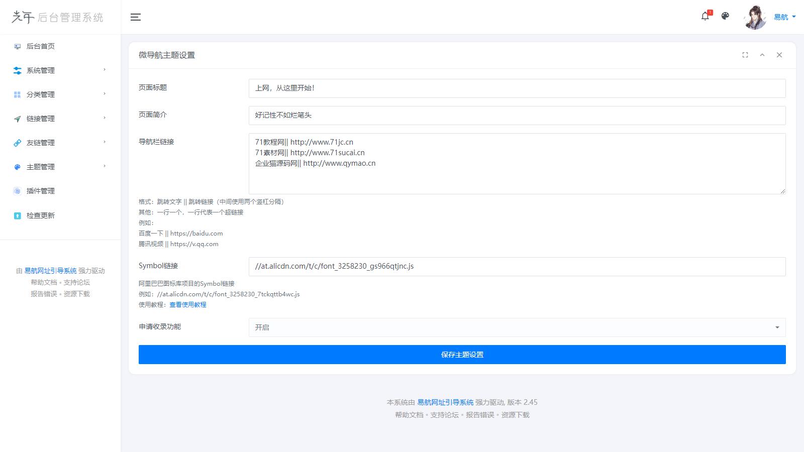 1、采用光年全新 v5 模板开发后台 2、后台内置 8 款主题色,分别是简约白、炫光绿、渐变紫、活力橙、少女粉、少女紫、科幻蓝、护眼黑 3、可管理无数引导页主题并且主题内可以进行不同的自定义设置,目前内置 16 套主题 持续增加中… 4、可单独开发各种插件,插件可进行自定义设置,目前内置七款实用插件 5、无需安装解压部署即可使用 6、数据管理包采用易航原创 JsonDb 数据包 7、主题内置神奇的 $this 语法 可快速开发并保留著作版权 8、对前台 URL 进行伪静态重写 对搜索引擎更加友好 9、内置硬防洪和硬防墙插件 告别域名忧虑 10、系统全开源 告别后门风险,