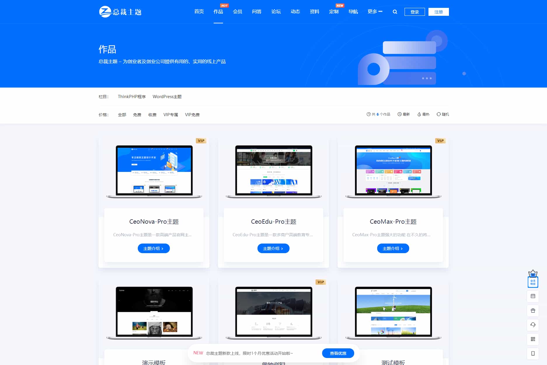 WordPress资源产品展示类主题 官网主题 CeoNova-Pro_v4.4 开心版 CeoNova-Pro主题是一款轻量级、且简洁大气、产品官网类主题,定位于高端产品官网、同时包含了知识付费、 定制服务、问答社区、论坛交流、网址导航、以及付费产品购买下载等全方位覆盖。 CeoNova主题并非总裁主题官方原规划内的产品,本款主题的推出源于总裁主题官网改版的同时同步上线。