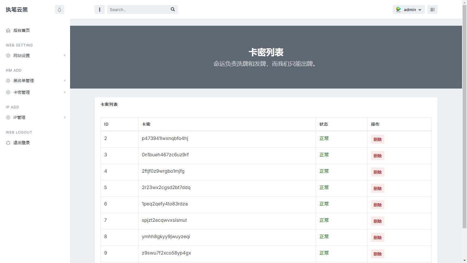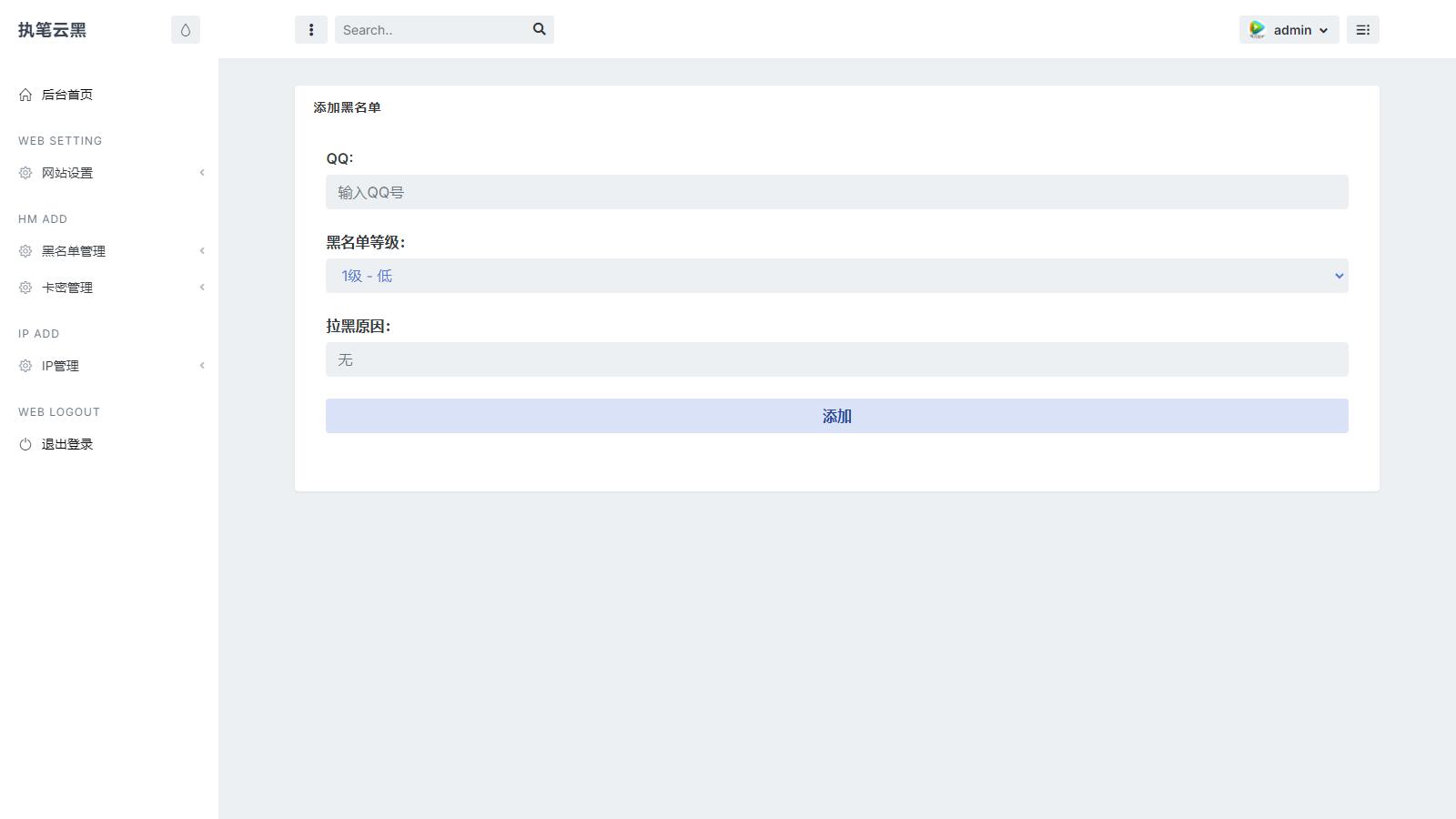 这套系统呢是玖逸之前南逸写的一套云黑系统,功能带有卡密生成和添加黑名单等, 源码放在我的网盘里已经两年之久,由于玖逸现在已经跑路了所以现在发出来分享给大家, 需要的可以自己拿去而开,反正功能也不是很多具体的自己看程序截图即可。