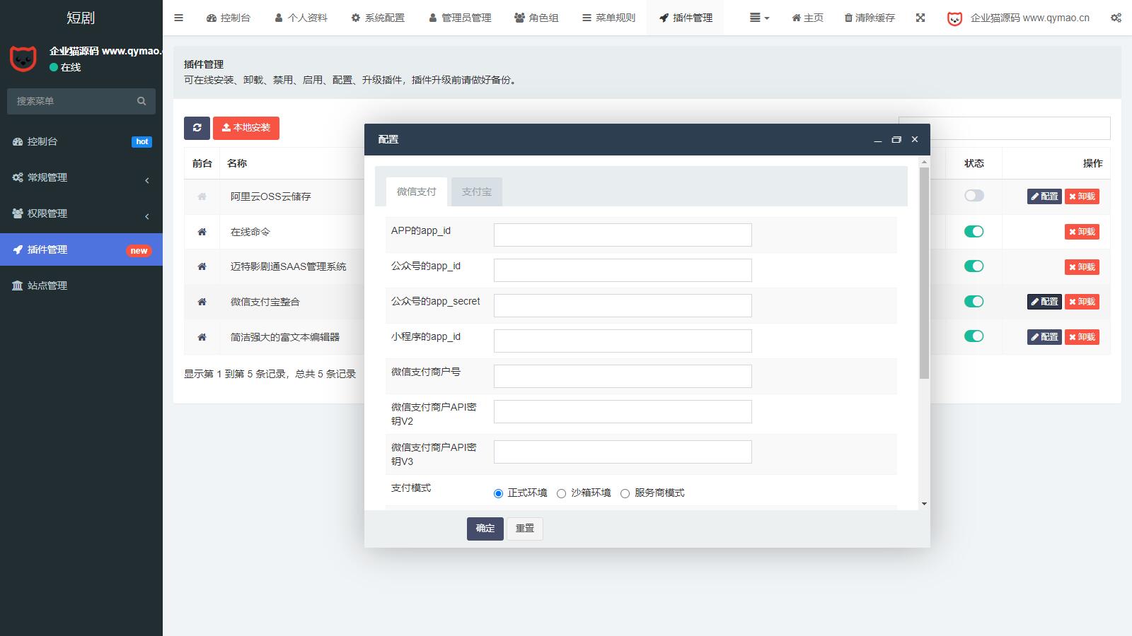 1.依旧采用saas版本,可无限多开。(仅限同一域名无限多开,如果子站点独立域名需收取100元/个域名费用) 2.目前支持微信小程序、公众号、APP 3.分销商等级自定义价格配置 二级分销功能 强大的卡密兑换(vip卡密,积分卡密,经销商卡密) 源码开源(有一个加密授权文件,不影响任何二次开发) 7.支持批量导入 8.手机号登录功能 企业猫只测试了后台部分,但前台得要公众号。企业猫没有,就没测试 前台教程也很详细,感兴趣学习一下的可以下载下来看下。 仅供学习研究之用,请勿商用,商用请支持正版