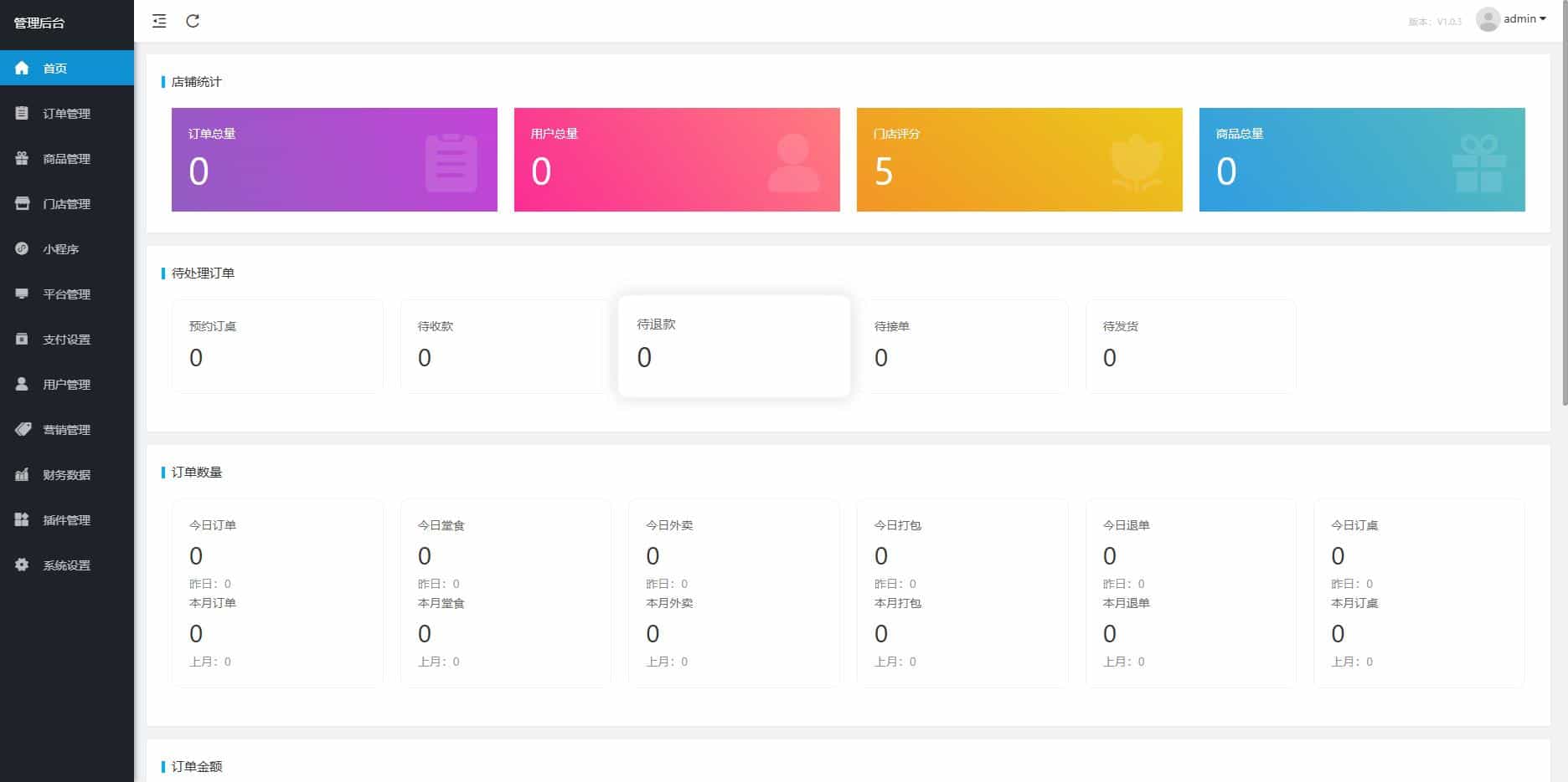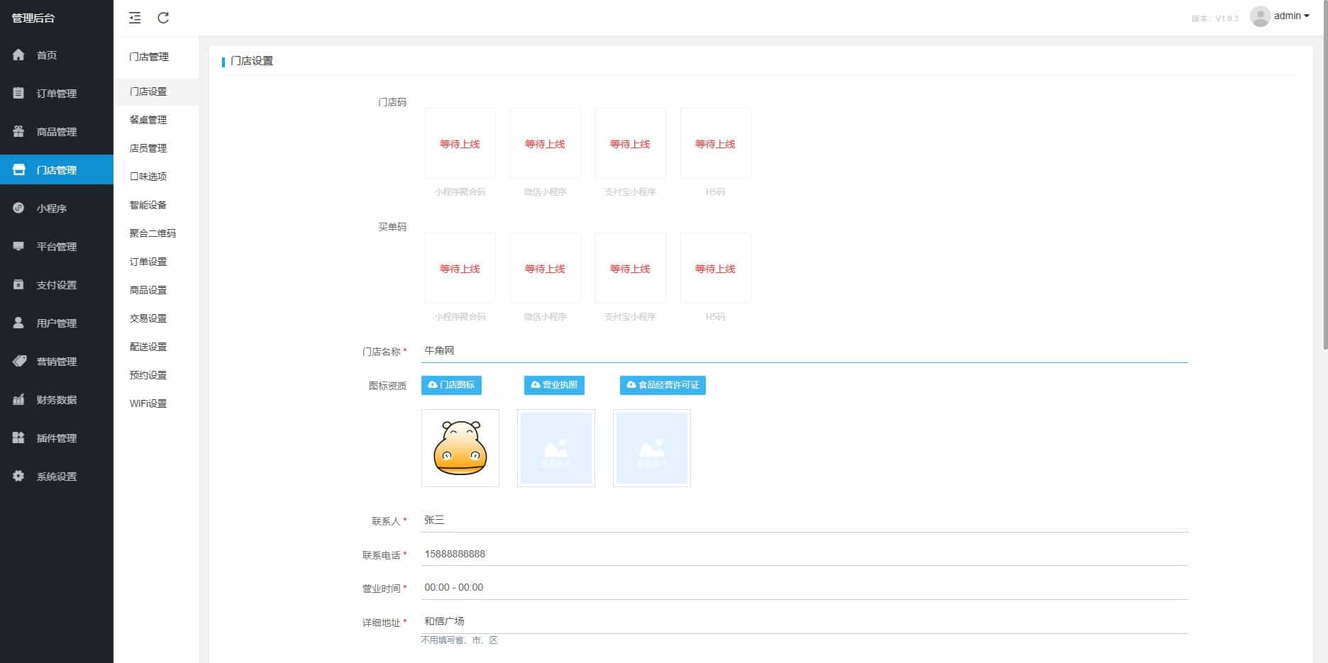1.支持多平台:微信小程序,支付宝小程序,和H5平台,页面可以后台DIY管理。 2.小程序页面支持后台DIY,后台修改后即可同步到发布的小程序页面。 3.点单模式:支持堂食,外卖,打包自取。 4.下单:支持多人同时,中途加菜,退单等。 5.订单提醒:支持小程序订阅消息,公众号模板消息,小票打印。 6.结算方式:微信,支付宝,余额,餐后线下等。 7.商品管理:单,多规格,起售数量,打包费,库存销量推荐等操作。 8.门店管理:餐桌,店员,口味,云设备,二维码,wifi,预约订桌等管理。 9.会员卡:付费开会员,积分等级,等级折扣,升级赠送,卡面定制等。 10.积分签到:签到赠送积分或余额,添加签到任务等。 11.会员充值:前后台充值操作,充值套餐,充值送余额,充值送优惠券等。 12.优惠券:现金券(满减),折扣券(满折),赠送券(满赠)等 13.财务统计:实时统计,七日趋势,日统计,月统计,指定时间段统计,报表下载,打印等。 14.小票打印:易联云,飞鹅,大趋等品牌打印机。(其它可扩展) 15.第三方配送:河马跑腿,闪送,UU跑腿,顺丰同城,达达配送,码科配送(其它可扩展) 16.小票打印:易联云,飞鹅,大趋。(其它可扩展) 17.云存储:腾云,阿里,七牛(其它可扩展) 18.短信:腾云,阿里,七牛(其它可扩展)
